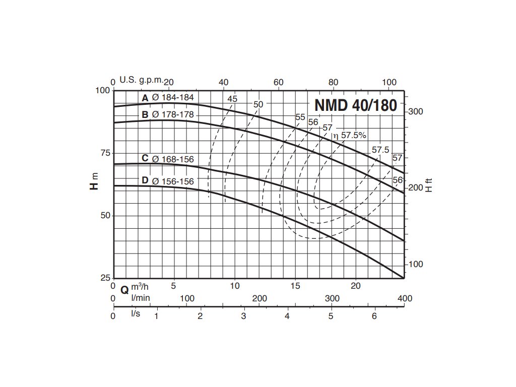 - Max. výsledný povolený tlak v tělese čerpadla: 10 bar (16 bar pro čerpadla NMD 25/190; NMD 32/210; NMD 40/180)