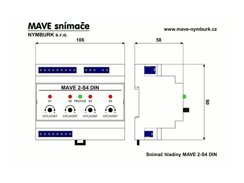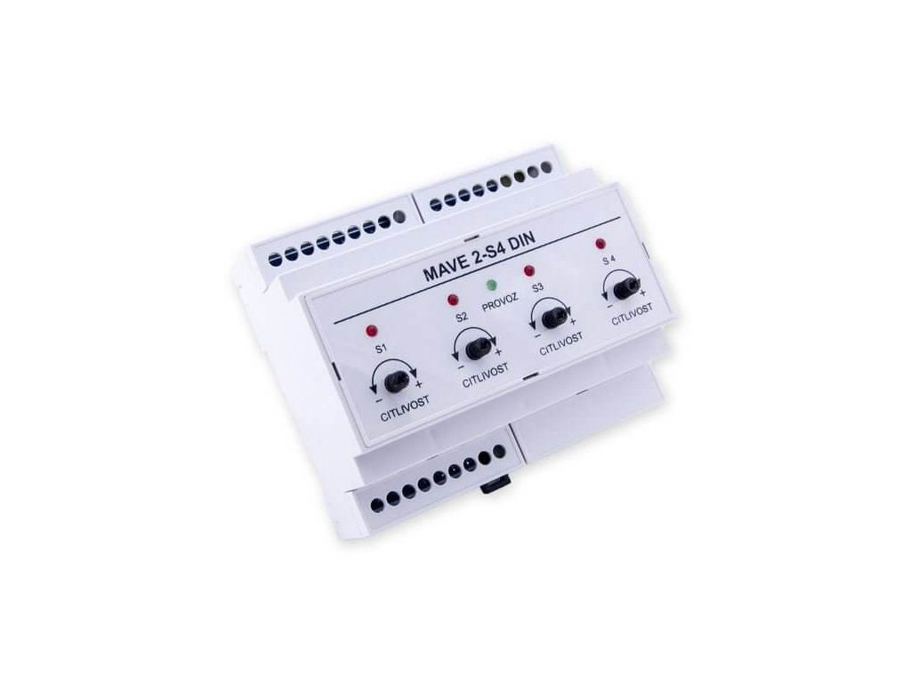 Snímač nahrazuje funkce čtyř samostatných snímačů MAVE 2-S1. Limitní snímání čtyř nezávislých havarijních hladin (min/max). Pro připojení čtyř vodivostních sond MAVE. Možnost nastavení vstupní citlivosti snímání pro aplikace, kde se používá upravená voda. Snímače hladiny MAVE 2-S4 DIN se vyrábějí v provedení pro montáž do rozvaděče na DIN lištu 35 mm.