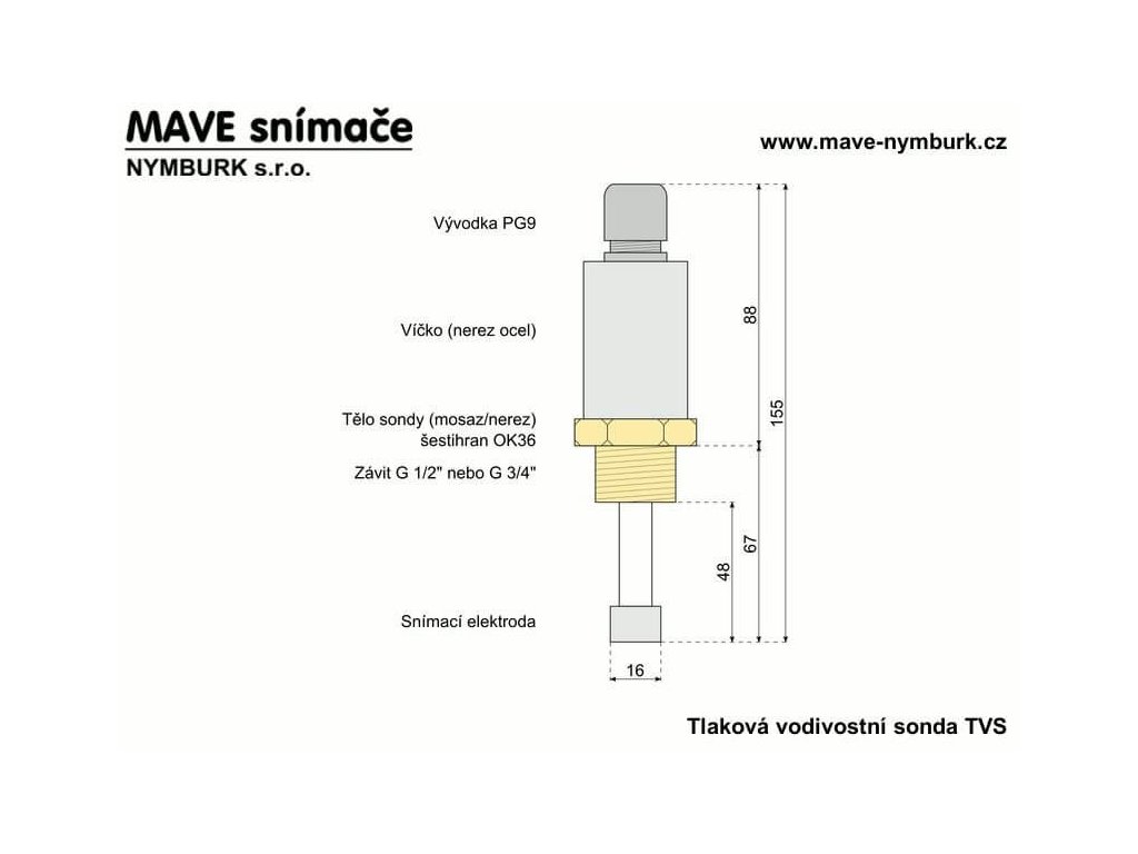 Vodivostní sonda pro snímání jedné hladiny; montáž sondy vodorovně do boku nádrže. Tlakové vodivostní sondy TVS se vyrábějí v základním mosazném nebo celenerezovém provedení, s připojovacím závitem G 1/2" nebo G 3/4". Návarky (ocel/nerez) pro montáž sondy najdete v sekci Příslušenství. Sondy se připojují k vodivostním snímačům hladiny MAVE 2. Elektrické připojení sondy je realizováno pomocí kabelových ok, která jsou elektricky spojena se snímací elektrodou a pouzdrem sondy. Sondy jsou dodávány bez připojovacího kabelu. K připojení lze použít libovolný PVC kabel (doporučujeme 2x 0,5 mm2 nebo 2x 0,75 mm2), není nutné používat stíněné kabely. Při použití sond v nádobě z elektricky nevodivého materiálu je nutné použít jednu sondu jako společnou (referenční).