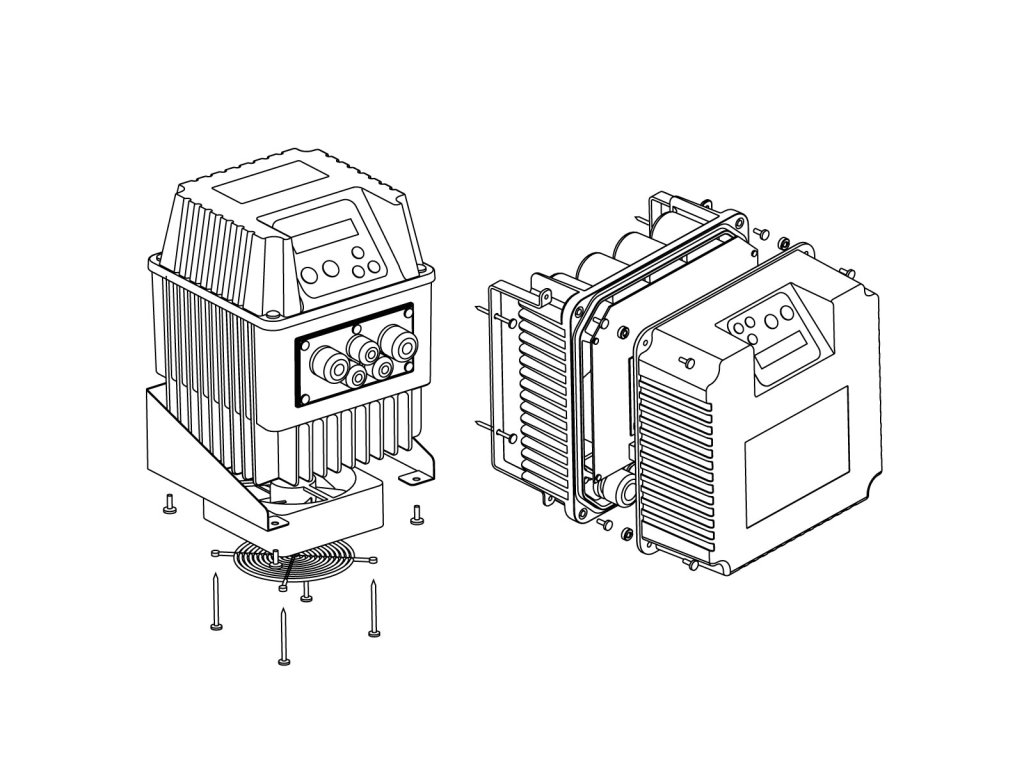 Chlazení je zajištěno externím chladicím ventilátorem připojeným k invertorovému chladiči. Pro montáž na stěnu je dodáván speciální kovový držák.